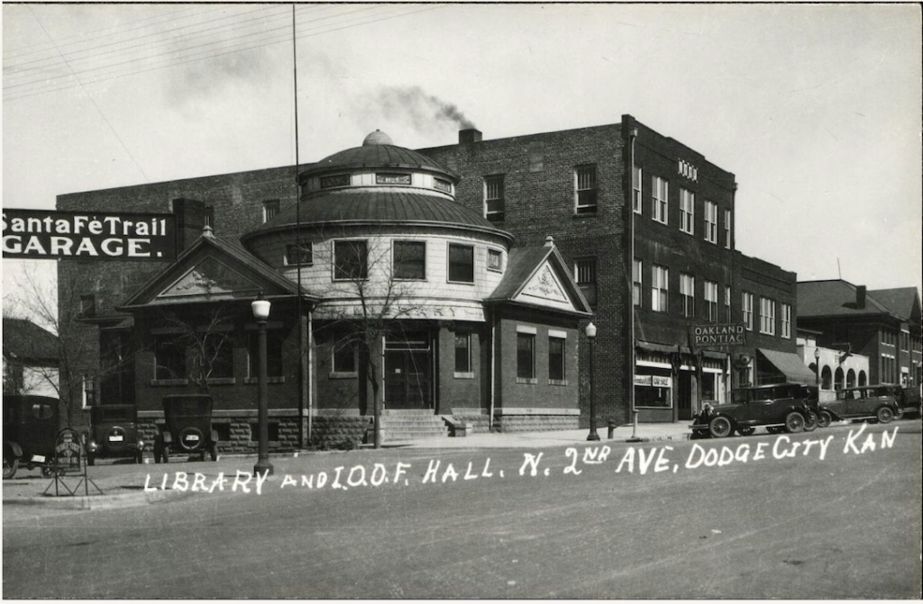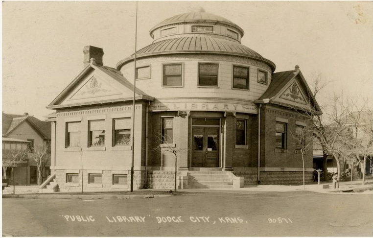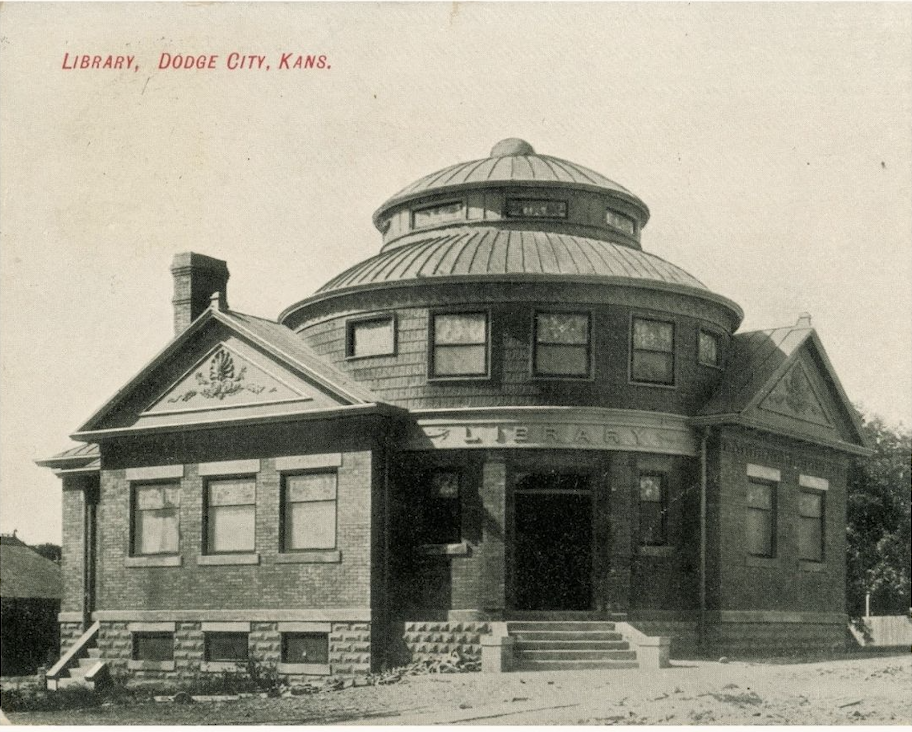 The photos are of the Carnegie Library in Dodge City (now the Carnegie Center for the Arts), which was established through a 1905 grant and officially opened to the public in February 1907, with Iva Nelson serving as the first librarian. In 1905, Local women’s clubs pushed for a public library, leading Judge E.H. Madison to petition Andrew Carnegie. Carnegie initially approved a $7,500 grant, which was later increased to $8,500 after the city met the necessary maintenance funding requirements. The building’s size was doubled in 1936 with support from the Works Progress Administration, which is why the structure today looks different from the original 1907 postcards.